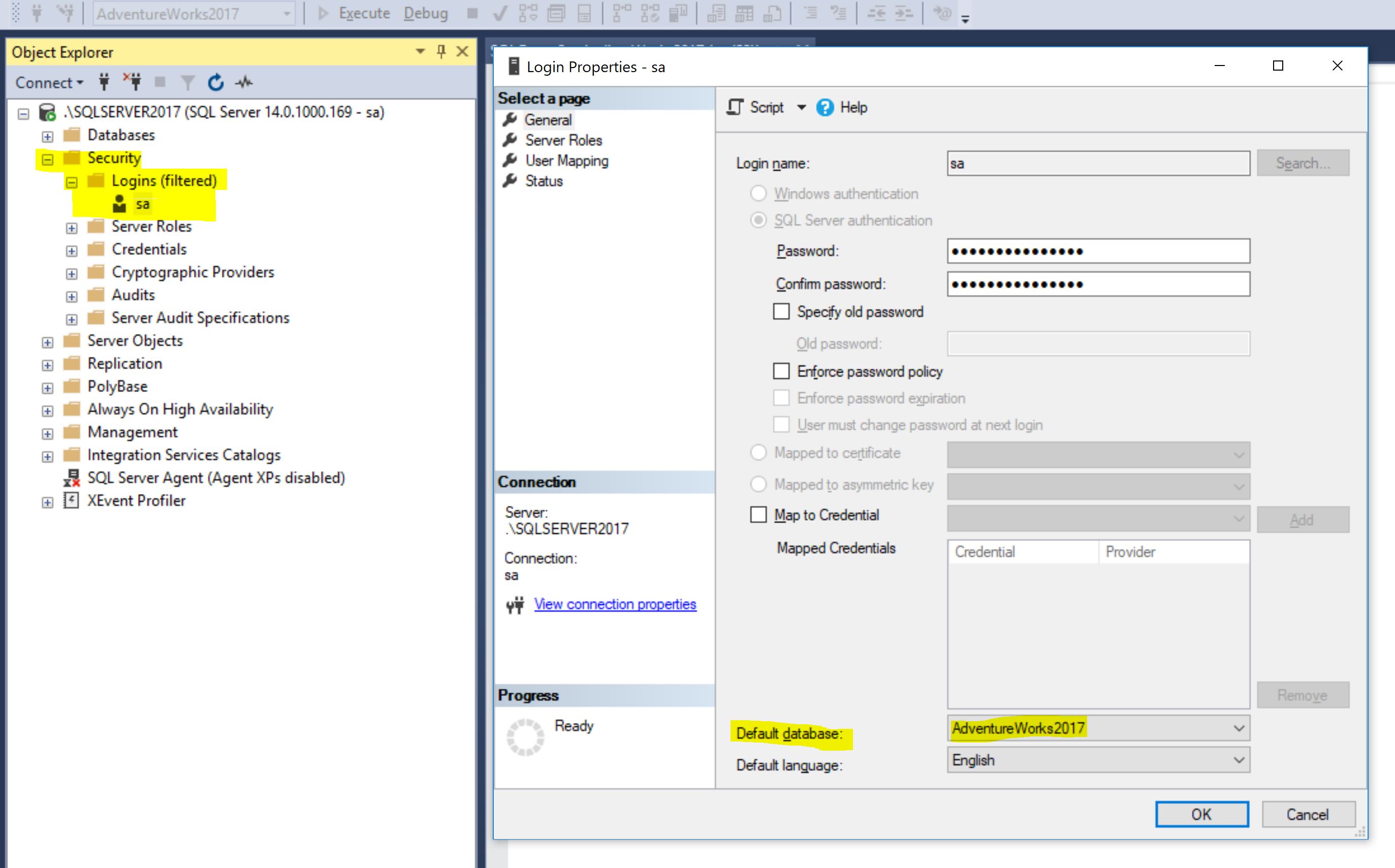 Now, most likely you are going to see “master” as the target database in the query window. If you have a preferred database, then you can set the “Default database” for the login and this will ensure that the query window uses your preferred database as the target database.