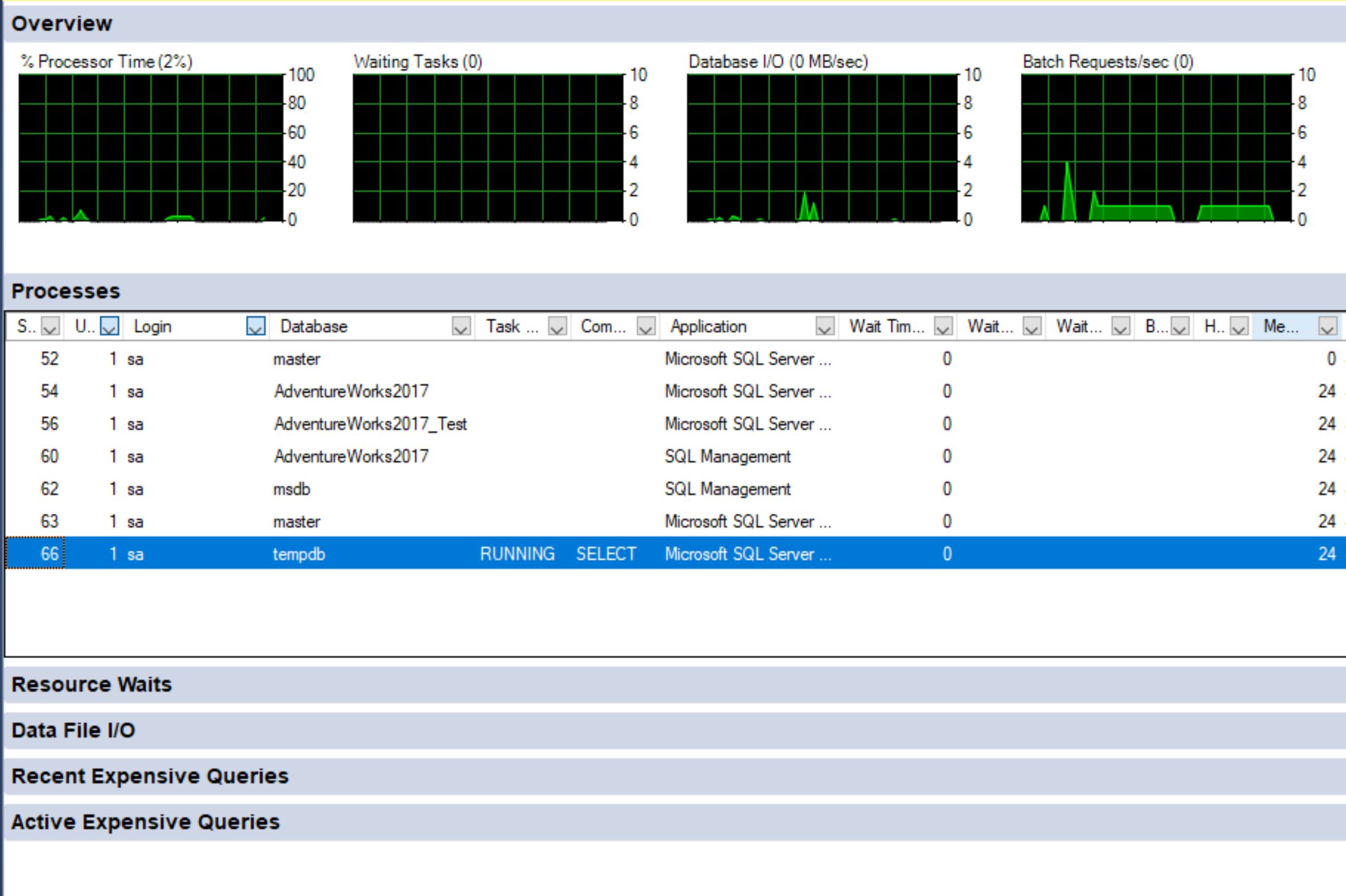 “sp_who2” stored procedure could be used to quickly display just the details of the Processes shown in Activity Monitor. But Activity Monitor displays a few other interesting details as well like “Recent Expensive Queries” and “Data File I/O”. From Recent/Active Expensive Queries one could find the problematic query and generate the Execution Plan too.