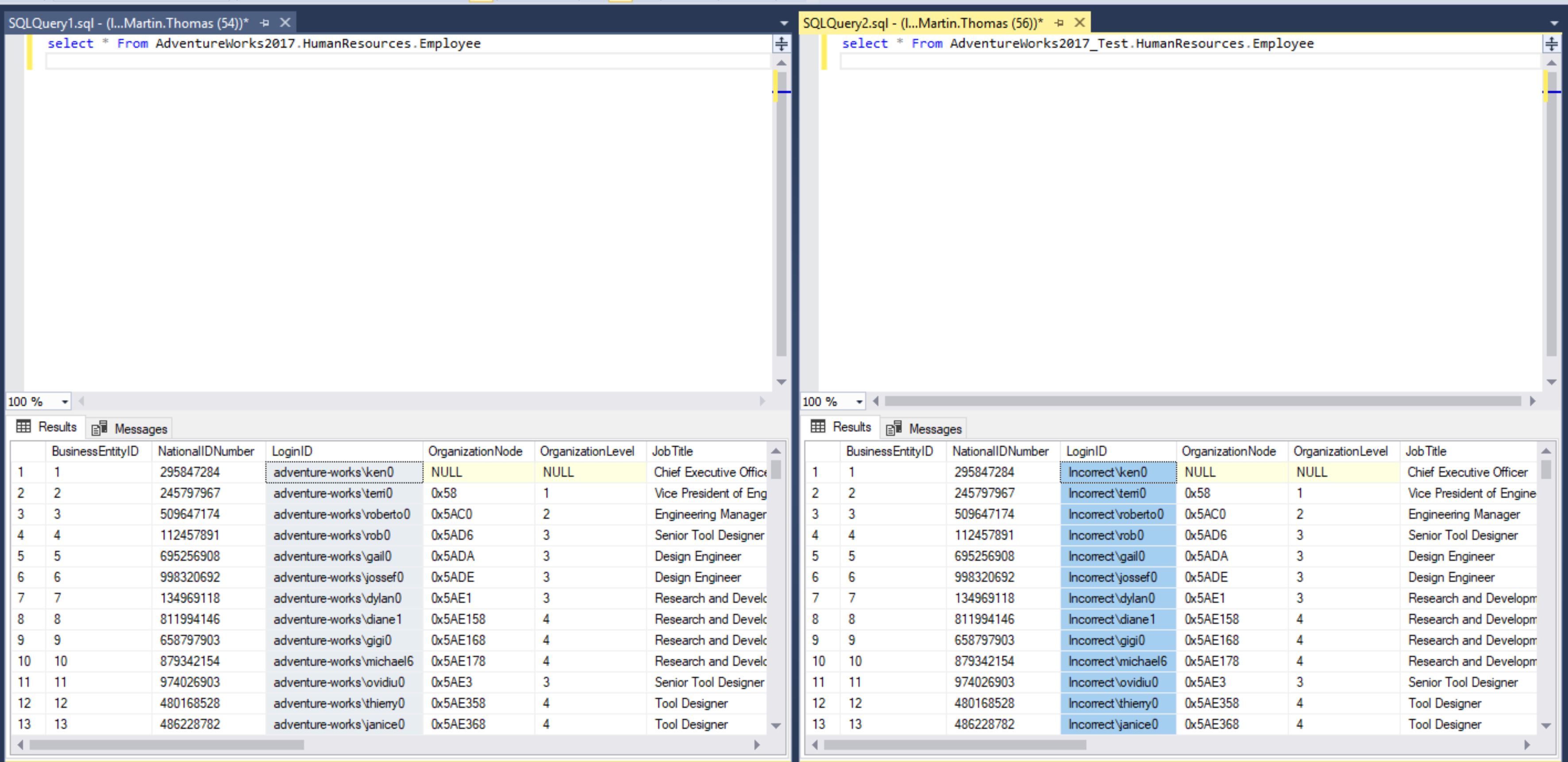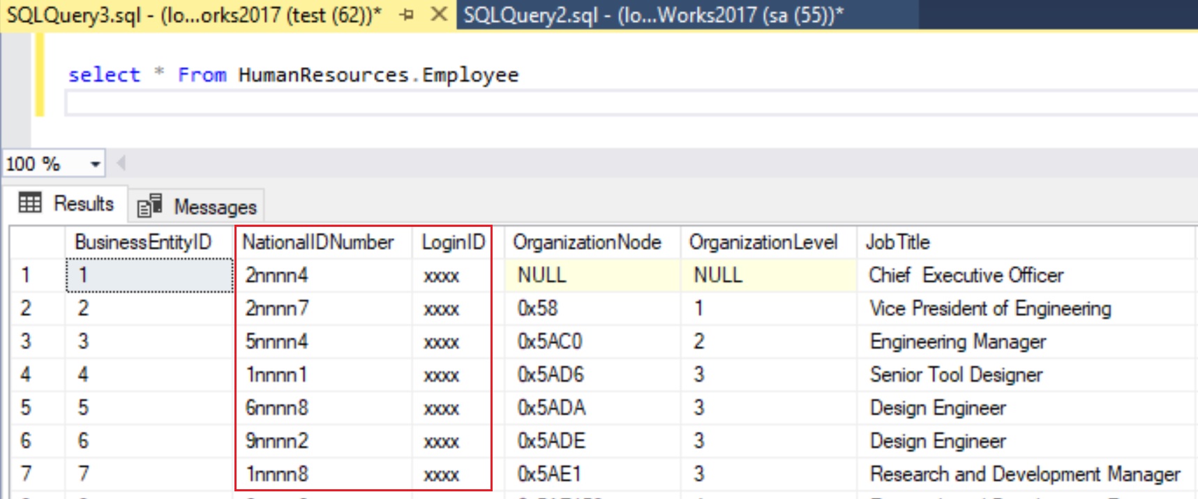 Dynamic Data Masking is a feature available in SQL Server since 2016 version. Unfortunately, this is not configurable using SSMS yet. Though, this post’s scope is around SSMS, I thought it is best to include this one as an exception due to its significance. DDM helps in setting specific columns in a table as “MASKED” so that users with less privileges will not be able to see sensitive data when querying the table. It is also helpful when sharing data outside one’s organization. No need to write your own masking logic anymore but you could use this inbuilt feature to do this. For example, in the below query results, NationalIDNumber and LoginID are masked.