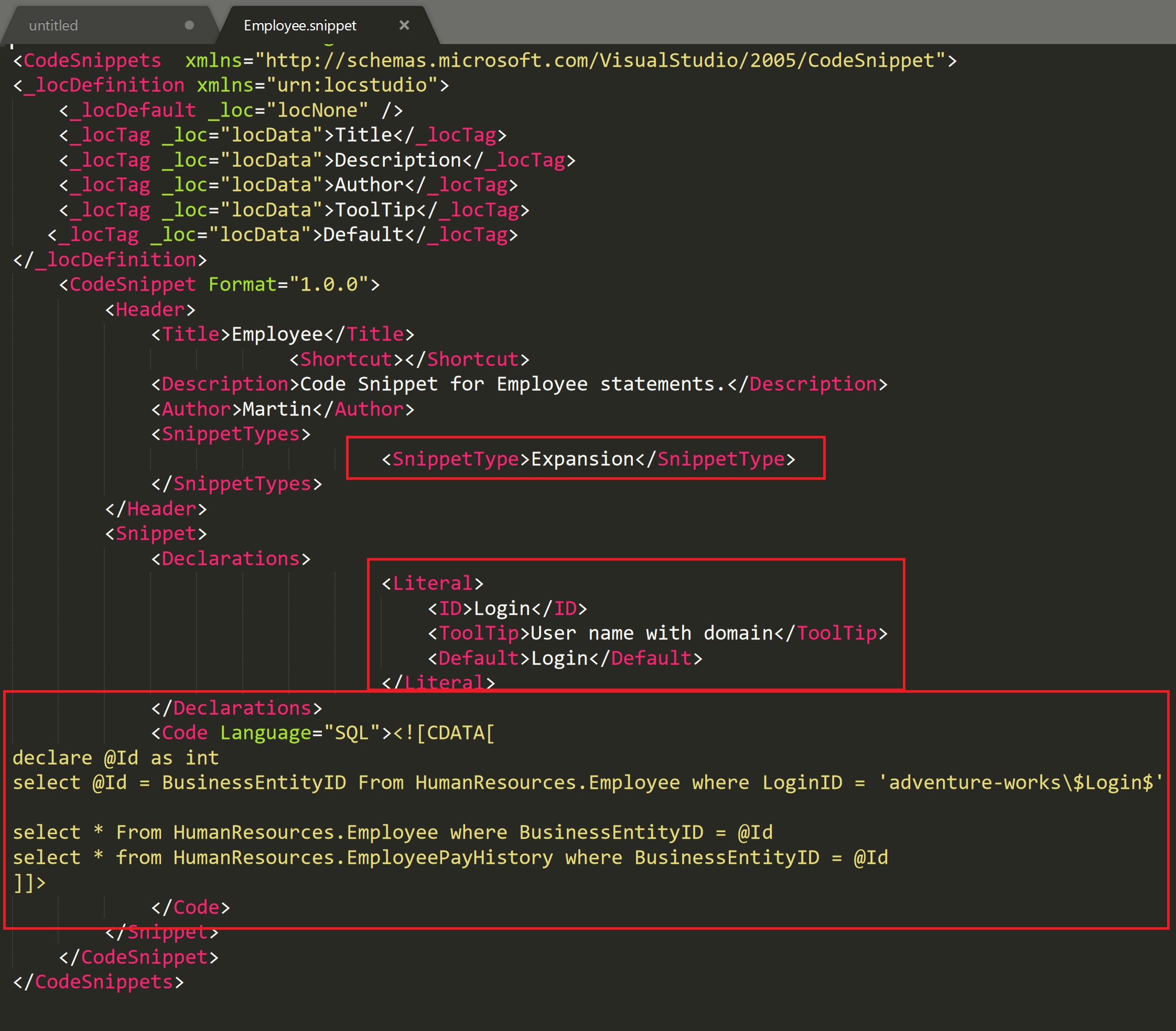 To insert an Expansion type snippet, press keys Ctrl+k,Ctrl+x (use Ctrl+k,Ctrl+s to insert a SurroundsWith type snippet) and then simply select the snippet. This will insert the code into the editor. Snippets support literal (variables like Login in the script) highlighting and the values can therefore be easily inserted in place of the literal.