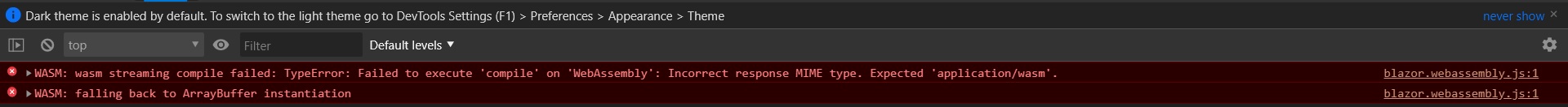 However, the static hosting model does not do justice to the mono.wasm asset in the published files. You could see following error in the browser console.
