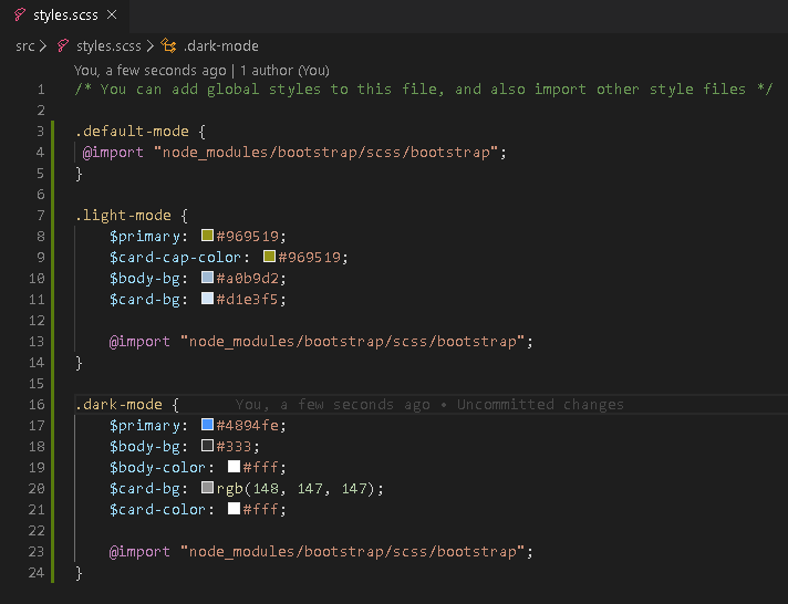 Bootstrap has default values for variables like “$primary”. We are simply providing initial values for these variables so that the SASS compiler will use the ones provided by us to create the final CSS stylesheet. This way we do not have to provide CSS rules to change the color of every component one by one like for buttons, links, etc. It is not required to have all themes in styles.scss file. In fact, it is good to keep themes in separate SCSS files and import those SCSS files in styles.scss.